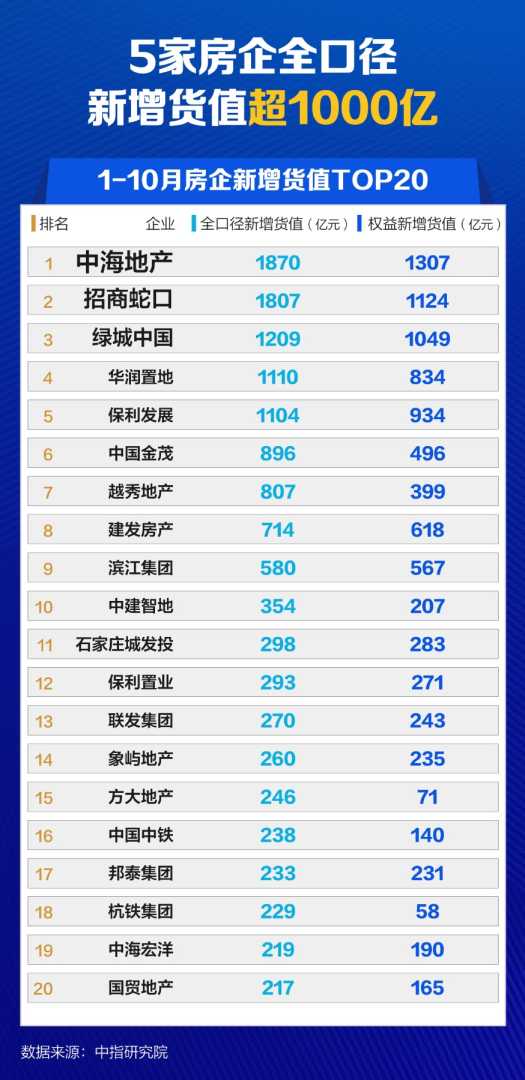 从新增货值来看,1-10月,中海、招商和绿城位列前三。其中,中海以1870亿元新增货值位列第一,招商、绿城新增货值规模分别为1807亿元和1209亿元,分列第二和第三位。值得关注的是,中海地产、招商蛇口、徐汇城投、中旅投资联合体完成对徐汇东安城市更新项目的股权交易,获得该地块开发权,协议总出让金额高达439.5亿元,在刷新全国涉宅用地出让总价纪录的同时,使得中海地产、招商蛇口的货值大幅提升,这一合作模式也成为了行业内的典范。