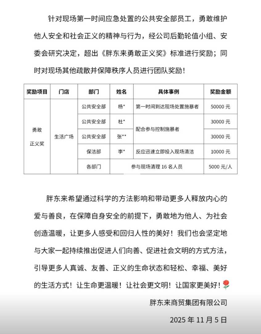 11月5日,胖东来就生活广场故意伤害事件发布员工勇敢正义奖励公示,这一事件引发了社会广泛关注。此次胖东来生活广场的突发事件,不仅关乎公共安全,也凸显了社会治安管理的重要性。