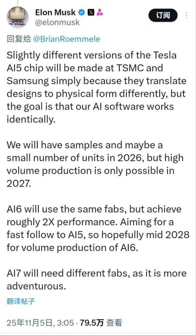 11月5日消息,马斯克称,AI5芯片样品预计将于2026年推出,计划于2027年量产,这一芯片进展引发科技界广泛关注。AI6芯片将采用相同的晶圆厂,但性能将提升约2倍,展现出芯片技术的持续革新。马斯克在社交媒体平台X上回应网友关于“Tesla AI5 芯片”的讨论时,首次披露了该系列芯片的生产计划与后续路线图,为行业提供了重要参考。马斯克明确表示,AI5芯片的大规模生产预计将在2027年完成,而AI6芯片则将在2028年推出,标志着特斯拉在芯片领域的持续投入。此外,AI5芯片将分别由台积电、三星电子制造不同版本。马斯克表示,由于台积电和三星电子的设计与物理形态转换上存在差异,特斯拉将分别生产略有不同的AI5芯片版本,目标是让AI软件能够在不同版本芯片上实现完全一致的运行效果,确保技术兼容性。至于生产进度,马斯克指出,2026年可能会有AI5的样品和小规模生产部署,大规模量产预计要到2027年才能实现。