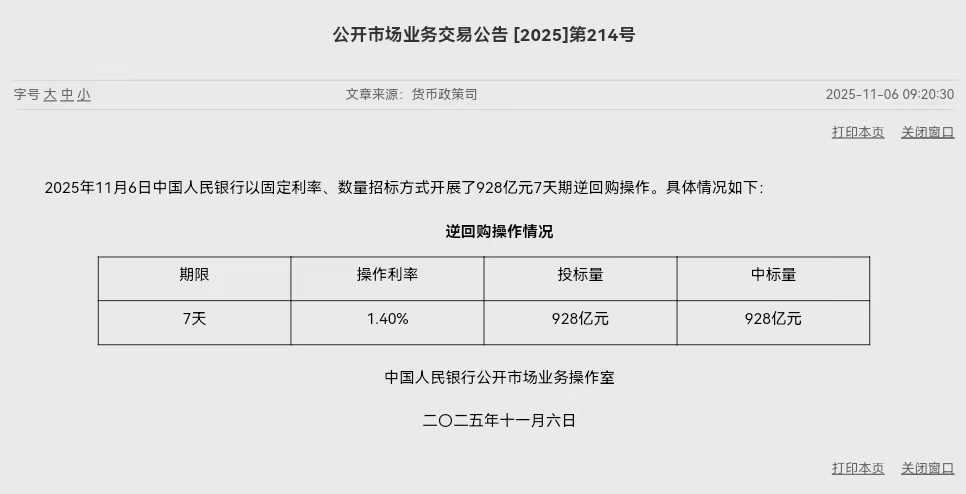 11月6日央行开展928亿元逆回购,净回笼2498亿元