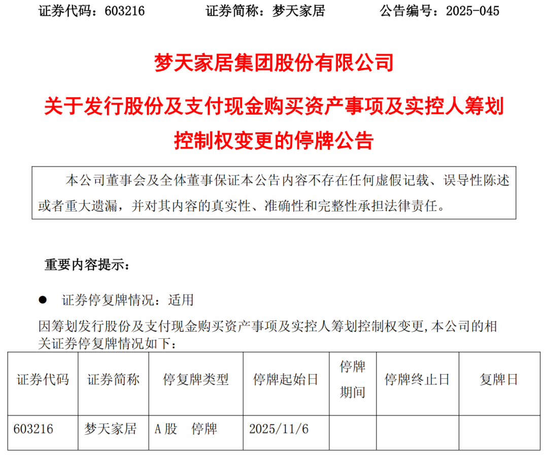 11月5日晚,梦天家居公告,因筹划发行股份及支付现金购买资产事项及实控人筹划控制权变更,公司股票自11月6日开市起停牌,预计停牌不超过10个交易日。梦天家居最新股价报15.70元/股,总市值34.96亿元,此次停牌引发家居行业对跨界并购的广泛关注。