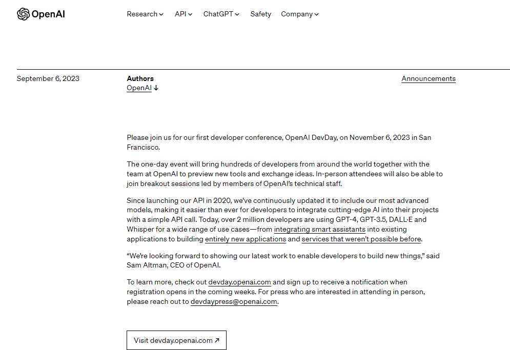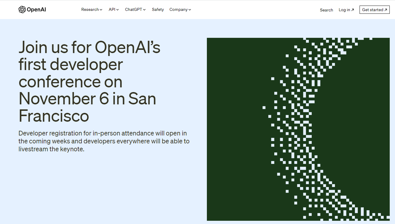 当地时间周三(9月6日),美国人工智能公司OpenAI在官网宣布,其将于2023年11月6日在旧金山举办首届开发者大会“OpenAI DevDay”。