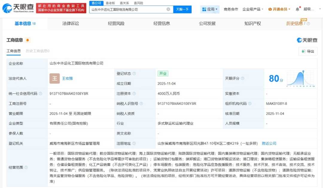 山东中外运化工国际物流成立,注册资本4000万