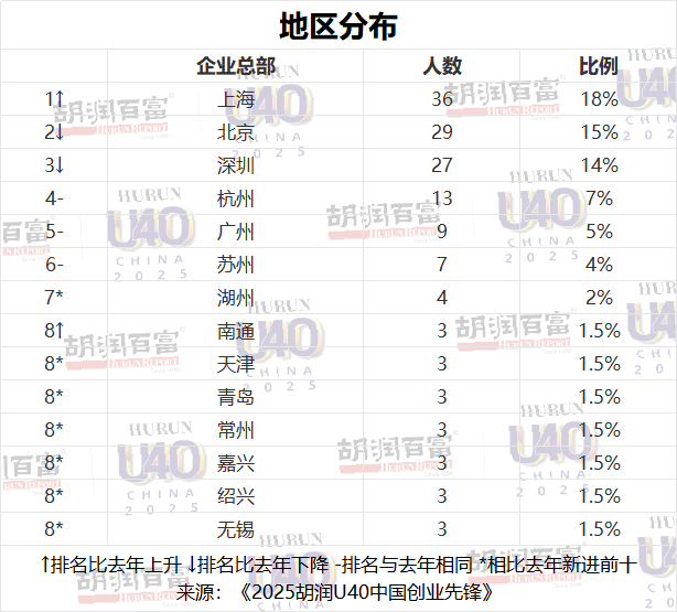 陈天石创立的寒武纪已是中国AI芯片龙头企业;徐冰参与创立的商汤科技作为老牌“AI四小龙”,实力稳居第一梯队;“新AI六小虎”历经行业洗牌,仅四家保持卓越表现,杨植麟的月之暗面是其中核心代表——它是上榜企业中成立时间最晚的,成立于2023年4月,在短短两年多时间里累计融资超110亿元。此外,闵可锐的秘塔也凭借专业优势,被誉为“中国版 Perplexity”。他称,U40创业先锋的城市分布,反映了各地创业生态的成熟度——集聚度越高的城市,往往也孕育着更多具备快速增长潜力的企业。今年上榜创业者来自53个城市,包括海外的新加坡和旧金山。而上海、北京、深圳、杭州、广州是最受U40创业者青睐的城市。其中深圳上榜人数为37人,占比14%。