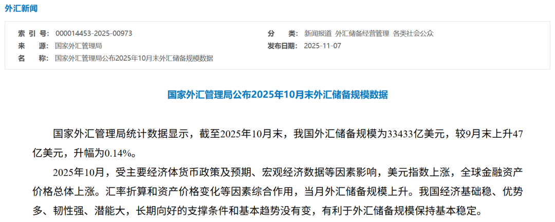 国家外汇管理局(下称外汇局)11月7日发布的最新统计数据显示,截至2025年10月末,中国外汇储备规模为33433亿美元,较9月末上升47亿美元,升幅为0.14%,为2015年12月以来的最高水平。目前,我国外汇储备已连续3个月稳定在3.3万亿美元以上,展现出外汇储备管理的稳健性。