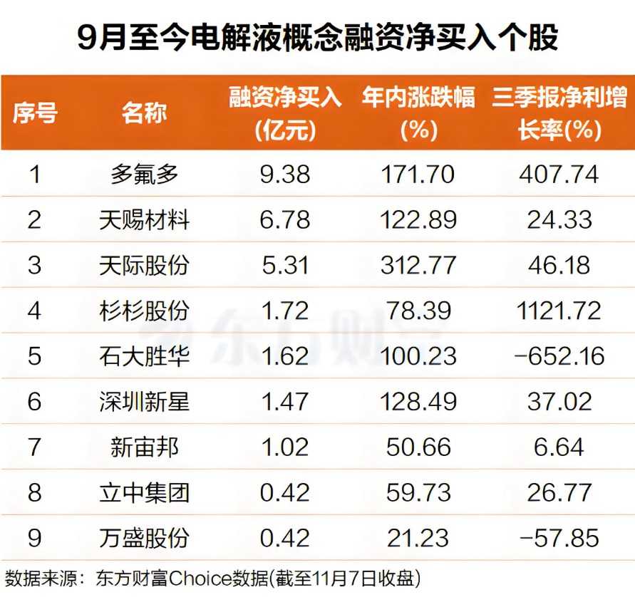 东方财富Choice数据显示,今年9月以来,杠杆资金净买入多只电解液与六氟磷酸锂概念股,其中多氟多排名第一,融资净买入超9亿元,该股年内涨幅超170%;天赐材料排名第二,融资净买入6.8亿元,年内涨幅超120%。天际股份、杉杉股份、石大胜华、深圳新星、新宙邦等个股融资净买额在5.3亿元至1亿元之间不等。