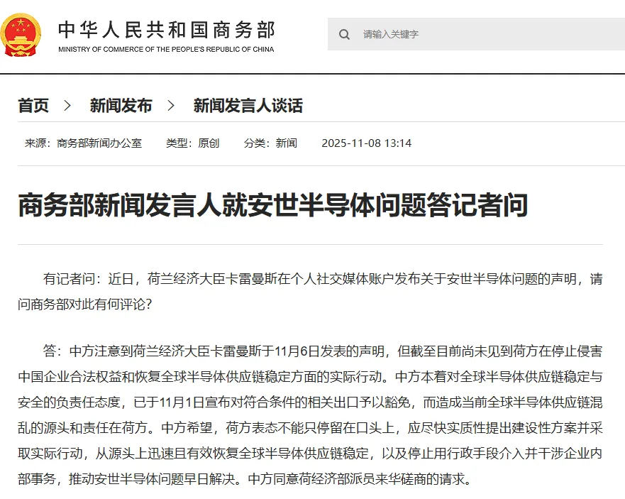 商务部回应安世半导体问题,呼吁荷方恢复全球半导体供应链稳定