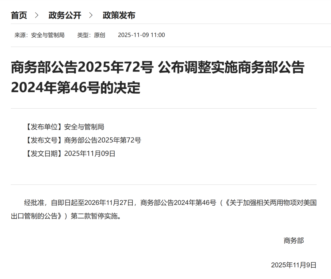 商务部发布2025年72号公告,决定自即日起至2026年11月27日,暂停实施2024年第46号公告中关于加强相关两用物项对美国出口管制的第二款内容,以适应国际贸易形势变化。