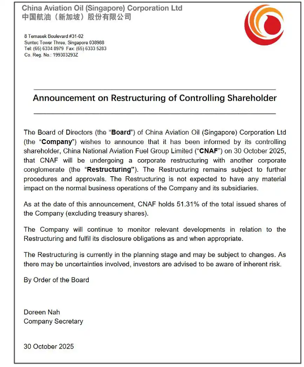近日,中国航空油料集团有限公司(简称“中国航空油料集团”)旗下中国航油(新加坡)股份有限公司发布公告称,中国航油(新加坡)股份有限公司董事会于2025年10月30日收到控股股东中国航空油料集团通知,中国航空油料集团将与另一家企业集团进行重组,此次重组或为中国能源行业带来重要结构调整。