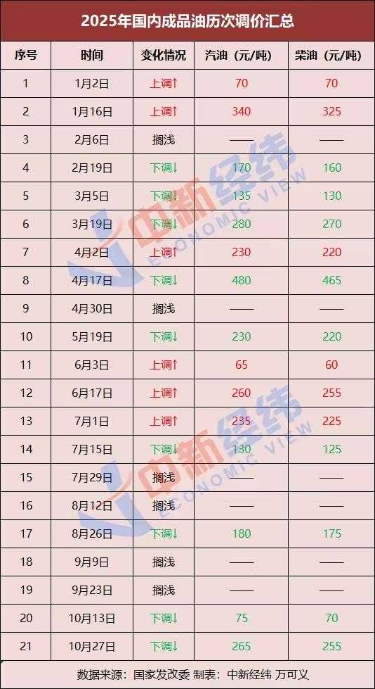 中新经纬注意到,今年以来,国内油价已经历二十一轮调价窗口,分别为“六涨九跌六搁浅”。涨跌互抵后,国内汽、柴油价格每吨较去年底分别下调745元、715元。若本轮调价落地,2025年调价格局将变为“七涨九跌六搁浅”,油价走势牵动市场神经。