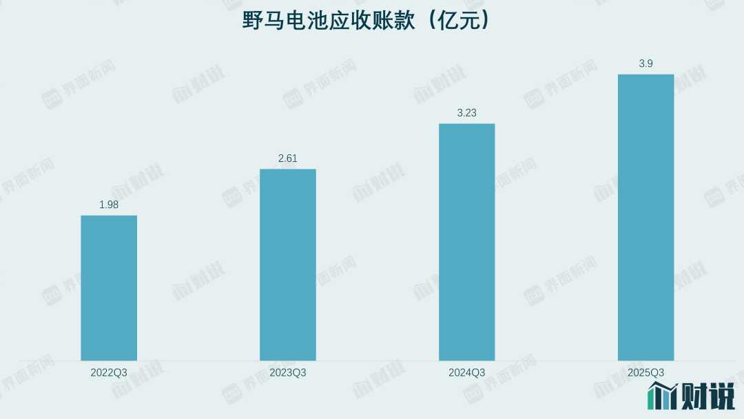 除了利润下滑,野马电池现金流状况也亮起红灯。截至2025年9月底,公司应收账款高达3.9亿元,同比增长20%,占当期总应收的38%,占总资产的17.3%。应收账款激增,意味着公司资金回笼效率下降,大量资金被客户占用,可能为了维持营收增长,放宽了客户信用政策,增加坏账风险。野马电池外贸业务占绝对主导地位,86%的营收来自出口,但海外客户受当地经济环境、贸易政策影响较大,增加了经营风险。