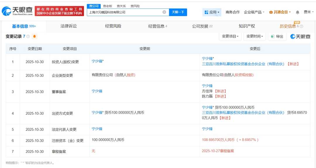南方财经11月10日电,AI技术领域迎来新动态,天眼查工商信息显示,近日,PopiAI关联公司上海次元模因科技有限公司发生工商变更,新增百度旗下三亚百川致新私募股权投资基金合伙企业(有限合伙)为股东,注册资本由100万人民币增至约108.7万人民币,同时部分高管发生变更。这一变更标志着百度投资在AI动画创作领域的进一步布局,上海次元模因科技有限公司成立于今年9月,法定代表人为宁少锋,经营范围包括电影摄制服务、动漫游戏开发、广告制作等。股东信息显示,该公司现由宁少锋及上述新增股东共同持股。