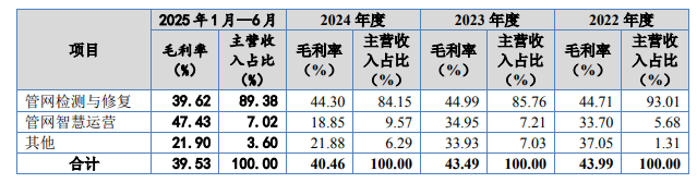 报告期内,公司毛利率分别为43.99%、43.49%、40.46%和39.53%,2024年主营业务毛利率同比下降3.03个百分点,主要系管网智慧运营业务毛利率有所下降。2023年下半年及2024年初,公司新增芜湖市部分片区污水管网及配套泵站运维服务,由于片区内防汛救灾及应急抢险压力较大,项目投入的运营维护成本较高,导致2024年该板块毛利率下降了16.10个百分点。