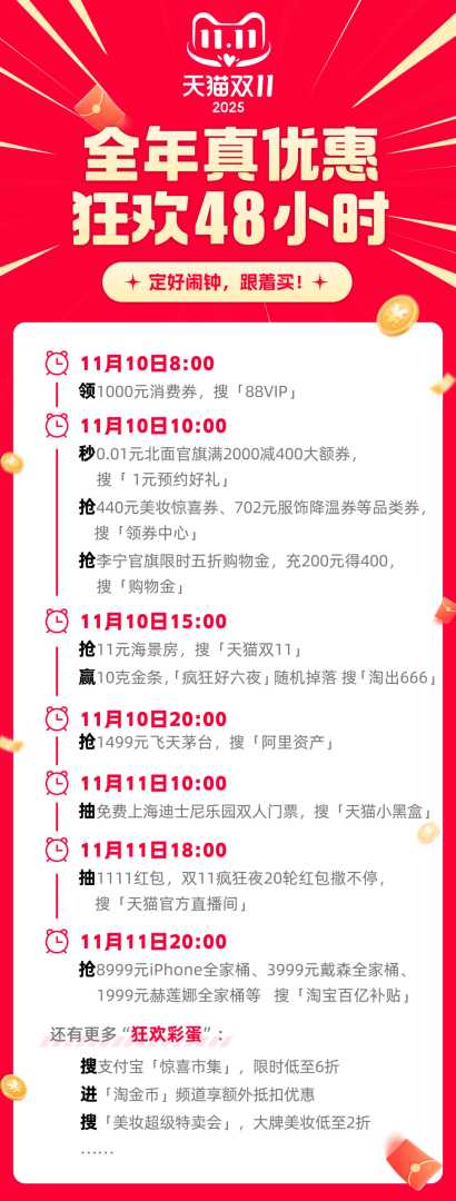 全年真优惠的天猫双11进入“狂欢48小时”,从11月10日0点到11月11日24点,每个时间点都有重磅权益和全年最优惠价格。88VIP消费券、品类券、海景房拍卖、明星直播红包等应有尽有,定好闹钟,跟着买就对了!