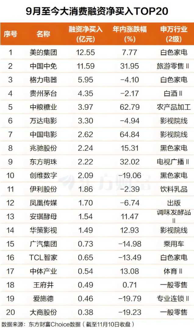 东方财富Choice数据显示,虽然消费股今年以来表现不佳,不过9月以来已经有杠杆资金提前布局多只大市值消费龙头股。具体来看,白电龙头美的集团排名第一,9月以来融资净买入近13亿元,该股今年以来涨幅仅超7%;周一涨停的中国中免排第二,9月以来融资净买入近12亿元。格力电器、贵州茅台、中粮糖业、万达电影、中国电影、兆驰股份、东方明珠、创维数字等个股融资净买额在6亿元至2亿元之间不等。从行业分布看,融资净买靠前的个股多分布于家电、免税零售、白酒、文化娱乐等行业,这些行业正是消费升级的主要领域。