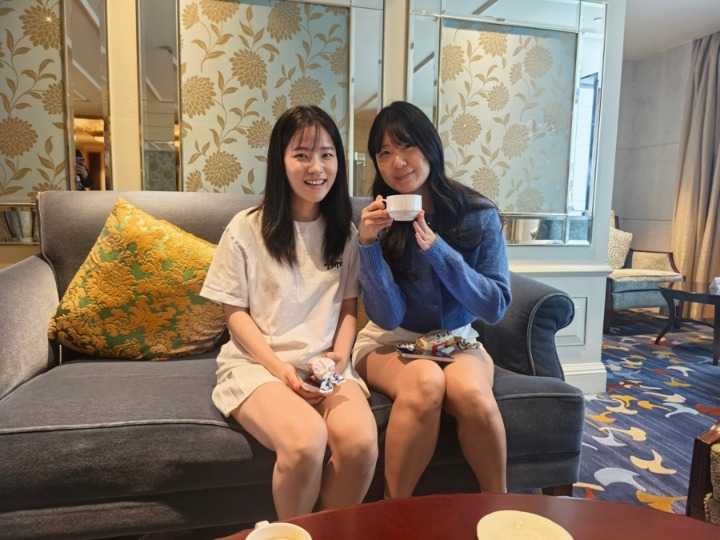 在上海大酒店入住3晚的韩国游客金恩菲和李珍元。 李宝花摄