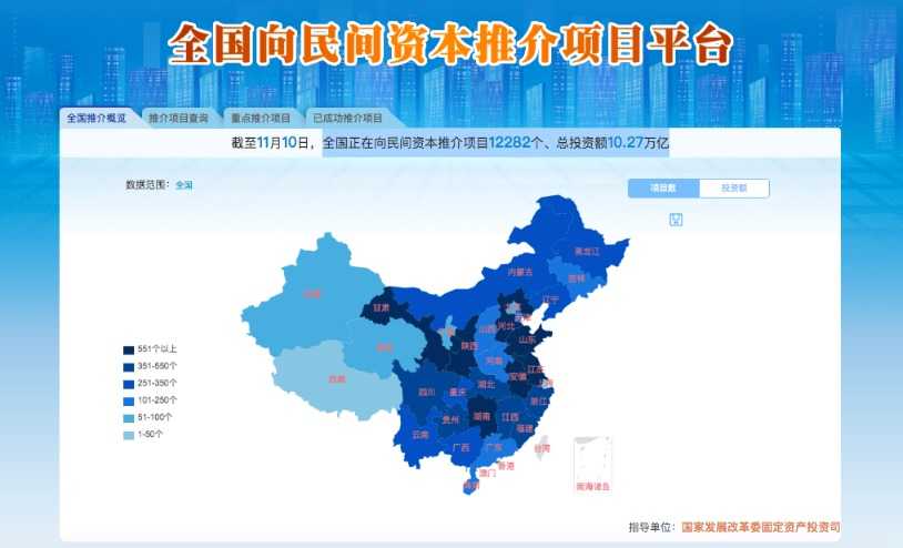 此外,国家发改委等部门建立了重点民间投资项目库,通过中央预算内投资不断撬动民间资本投入。“全国向民间资本推介项目平台”显示,截至11月10日,全国正在向民间资本推介项目12282个、总投资额10.27万亿。