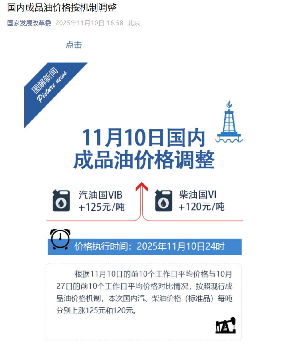 11月10日,国家发展改革委官微发布消息称,根据11月10日的前10个工作日平均价格与10月27日的前10个工作日平均价格对比情况,按照现行成品油价格形成机制,本次国内汽、柴油价格(标准品)每吨分别上涨125元、120元,价格执行时间为2025年11月10日24时。