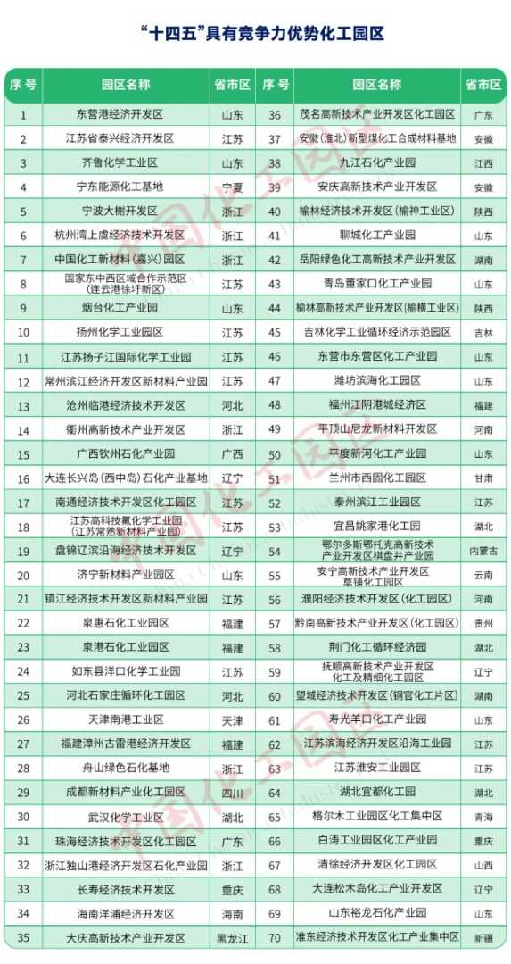 近日,中国化工经济技术发展中心发布“十四五”具有竞争力优势化工园区名单,确定4家园区为竞争力卓越化工园区,70家园区为“十四五”具有竞争力优势化工园区。
