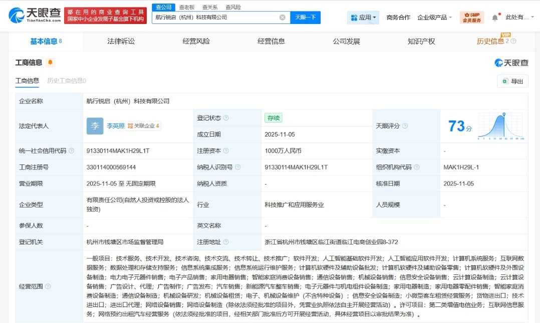 航行锐启(杭州)科技成立,聚焦人工智能领域