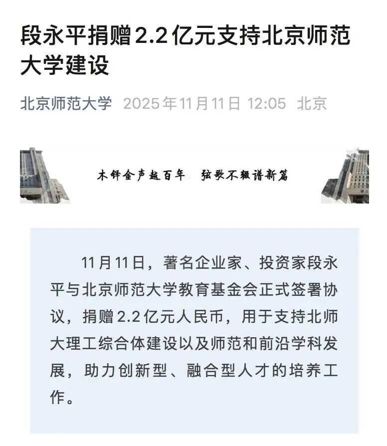 据北京师范大学微信公众号,11月11日,著名企业家、投资家段永平与北京师范大学教育基金会正式签署协议,捐赠2.2亿元人民币,用于支持北师大理工综合体建设以及师范和前沿学科发展,助力创新型、融合型人才的培养工作。这一举措彰显了段永平对教育事业的深厚情怀与大力支持,也为北师大的发展注入了强劲动力。
