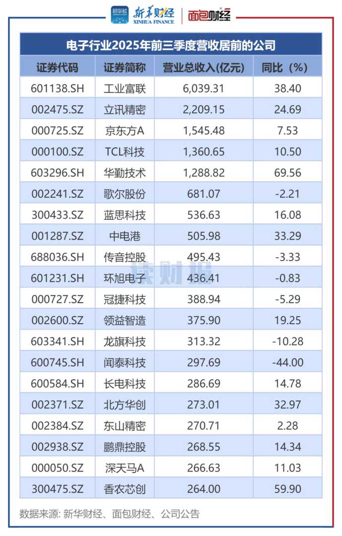 工业富联、立讯精密、京东方A前三季度营业收入分别达到6,039.31亿元、2,209.15亿元、1,545.48亿元,位列前三。此外,TCL科技、华勤技术2025年前三季度营收均超过千亿元。