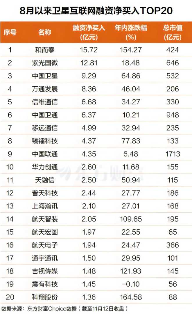 东方财富Choice数据显示,8月以来杠杆资金吸筹多只卫星互联网概念股,其中和而泰排名第一,融资净买入近16亿元;紫光国微排名第二,融资净买入近13亿元,卫星互联网概念受资金青睐。