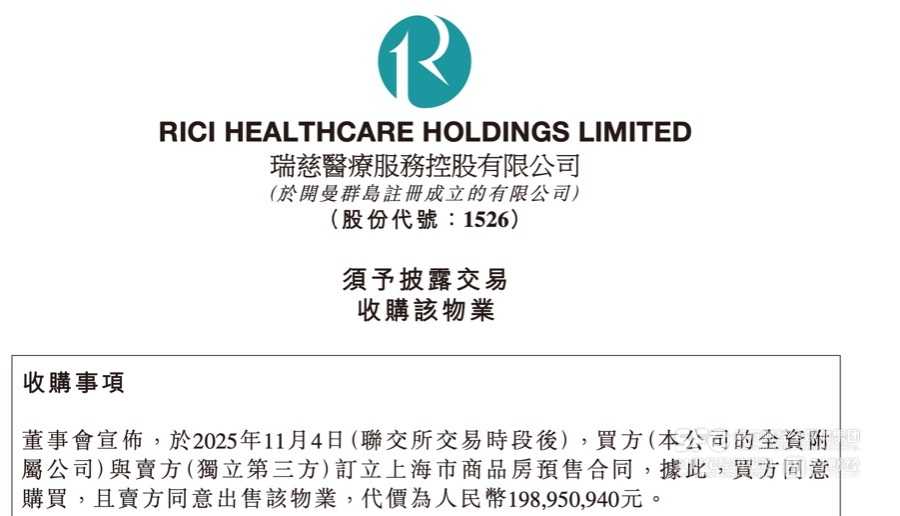 11月4日晚间,瑞慈医疗发布公告,其附属公司购入上海徐汇滨江云锦东方三期一套联排别墅,耗资约1.99亿元。购房款由内部资源拨付,该别墅成交单价刷新今年上海顶豪纪录。瑞慈医疗称此为优良中长期投资,目前公司正处于业绩调整期。