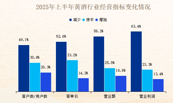 具体到黄酒行业经营指标的变化,黄酒生产企业经营情况总体呈现复苏态势。据中国酒业协会《2025年中国黄酒产业发展现状调研问卷》,今年上半年,58.2%、63.4%的调研企业表示黄酒营业额、营业利润有所减少;37.1%、34.3%的酒企表示黄酒销售量、销售额有所增加;同时,有20.3%的调研企业表示客户数量有所增加;客单价方面同比有所减少的企业比例达到 52.6%。