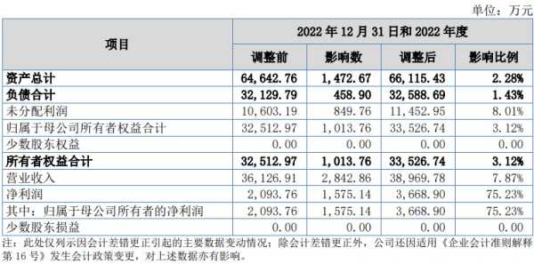需要指出的是,根据发行人会计差错更正信息,对报告期内2022年度和2022年末数据进行调整后,2022年营收调整前后数据分别为36126.91万元、38969.78万元,影响比例7.87%;净利润调整前后数据分别为2093.76万元、3668.90万元,影响比例达75.23%。