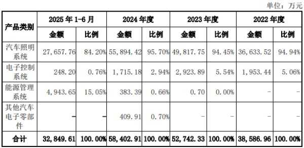 通宝光电主营业务收入的产品具体包括汽车照明系统、电子控制系统、能源管理系统及其他汽车电子零部件四大类。其中2022年至2025年上半年各期汽车照明系统收入占比分别为94.94%、94.45%、95.70%、84.20%;电子控制系统收入占比分别为5.06%、5.54%、2.94%、0.76%;能源管理系统收入占比分别为0、0.00%、0.66%、15.05%;其他汽车电子零部件收入占比分别为0、0、0.70%、0。此次IPO拟募集资金33000.00万元用于“新能源汽车智能LED模组、充配电系统及控制模块项目”,募资计划备受关注。