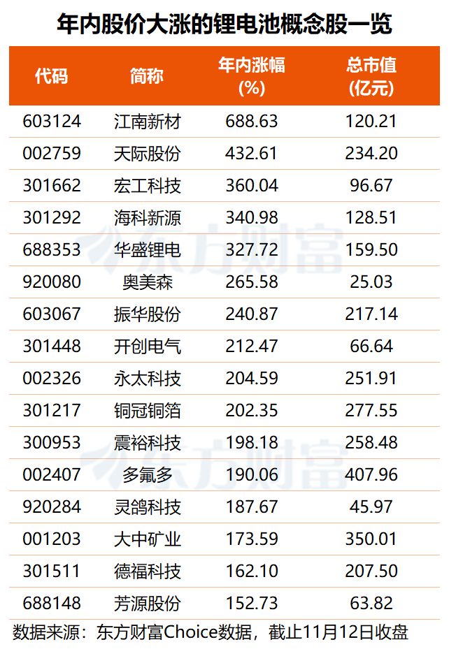东方财富概念板块显示,目前A股市场共有402只锂电池概念股,合计总市值达10.36万亿元,超九成锂电池概念股年内股价上涨,51股年内股价已翻倍;江南新材、天际股份、宏工科技、海科新源、华盛锂电区间涨幅居前,其中,江南新材累计上涨近700%。业绩方面,超半数锂电池概念股今年前三季度业绩报喜,净利增幅超100%的有74股,科力远、国轩高科、多氟多等净利同比增幅在4倍以上,晶瑞电材以19202.65%的增幅居首。