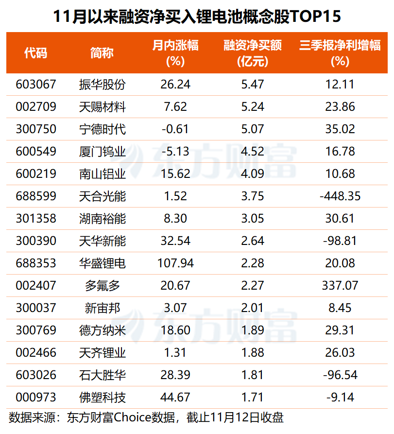 东方财富Choice数据显示,11月以来,共有169只锂电池概念股获融资净买入。其中,35股融资净买额超1亿元,振华股份、天赐材料、宁德时代位居前三,融资净买额均超5亿元。主力资金方面,月内共有40余股获主力资金净流入超1亿元,其中,南山铝业获主力资金抢筹逾11.5亿元,万华化学、胜利精密、诺德股份、兆新股份主力净流入资金规模均超5亿元。