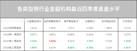 在息差变动方面,各类商业银行呈现出不同的趋势。股份制商业银行和农村商业银行的息差水平与上季度持平,而大型商业银行、城市商业银行、民营银行和外资银行的息差则有所下降,其中民营银行的下降幅度最大,达到0.08个百分点。