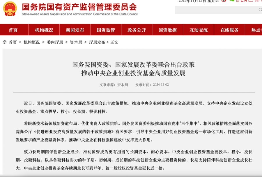 2024年12月,国务院国资委、国家发展改革委联合出台政策措施,推动中央企业创业投资基金高质量发展,支持中央企业发起设立创业投资基金,重点投早、投小、投长期、投硬科技,为科技创新企业提供了更多的融资机会。