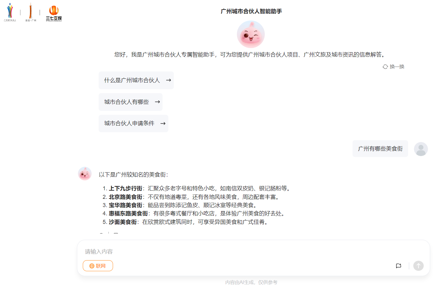 从赋能全运延伸至赋能城市发展,三七互娱的“AI+城市服务”布局更显纵深。基于“小七”打造的智能助手,并非局限于赛事服务,而是构建了覆盖多场景的“AI+城市服务”平台:一方面,它为广州“城市合伙人”计划充当“智慧顾问”,高效对接意向伙伴与城市发展机遇;另一方面,深度嵌入文旅出行、城市活动等高频场景,实现各类民生信息的快速查询,用技术打通城市服务与大众需求的“最后一公里”。据悉,这款智能助手的技术核心,是三七互娱自研的行业大模型“小七”——作为广东省首批通过国家网信办生成式人工智能服务备案的游戏垂类大模型,“小七”具备强大的多模态输入理解与高质量文本生成能力,为智能助手的高效运转提供了坚实支撑,推动AI技术在城市服务中应用。