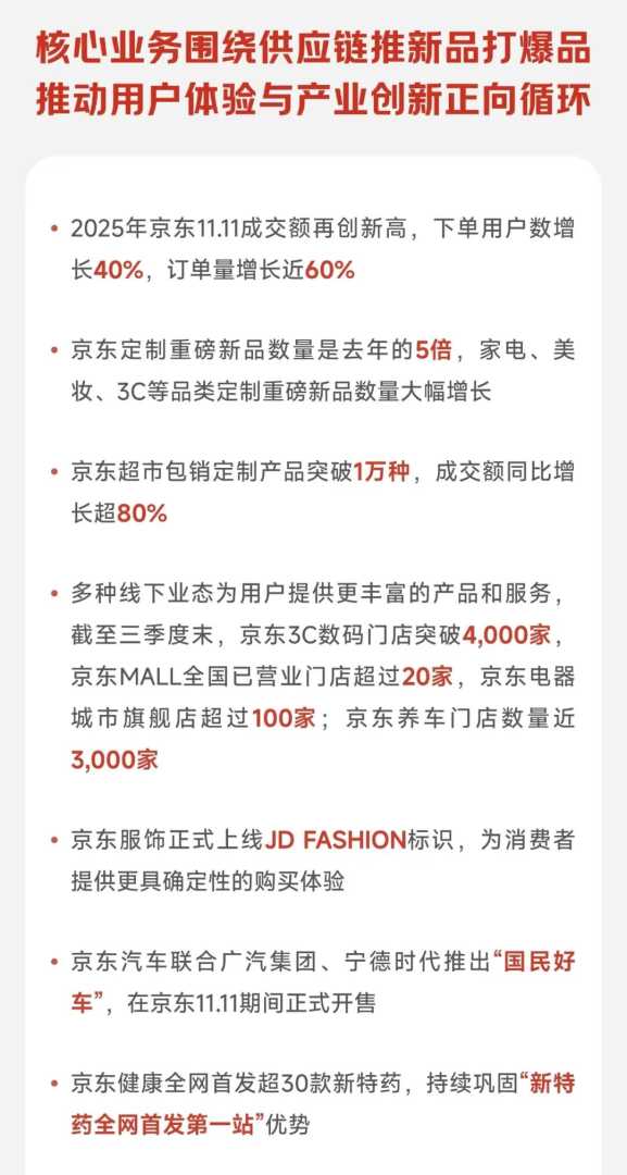 数据显示,在刚刚结束的2025年“京东11.11”,京东成交额再创新高,下单用户数增长40%,订单量增长近60%。京东集团表示,京东“11·11”所释放出来的消费热情和产业活力,得益于多年来持续投入打造的超级供应链,推动新供给创造新需求,促进生产、流通和消费的良性互动,超级供应链成为行业增长新动能。