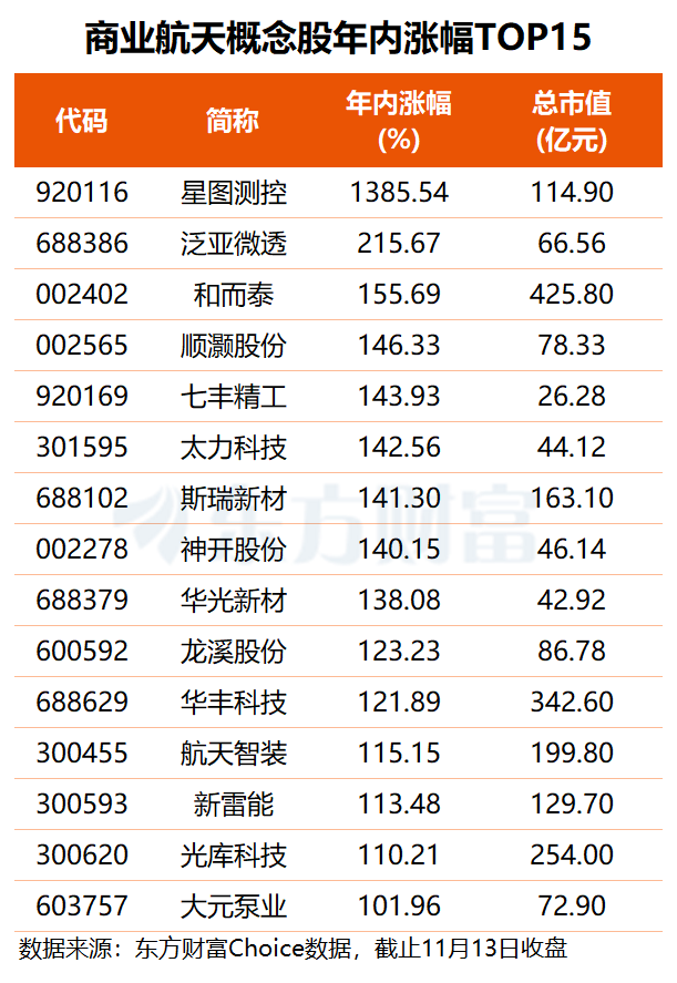 东方财富概念板块显示,目前A股市场共有169只商业航天概念股,合计总市值达2.11万亿元,近九成商业航天概念股年内股价上涨,其中星图测控区间涨幅居首,航天智装、斯瑞新材等十余股股价翻倍,商业航天概念受热捧。