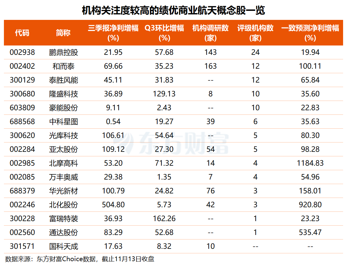 值得注意的是,前三季度净利同比增长、净利润规模超1亿元且第三季度净利环比增长的共有15只商业航天概念股,包括鹏鼎控股、和而泰、亚太股份、中科星图、富瑞特装、泰胜风能等。