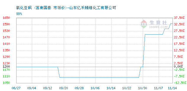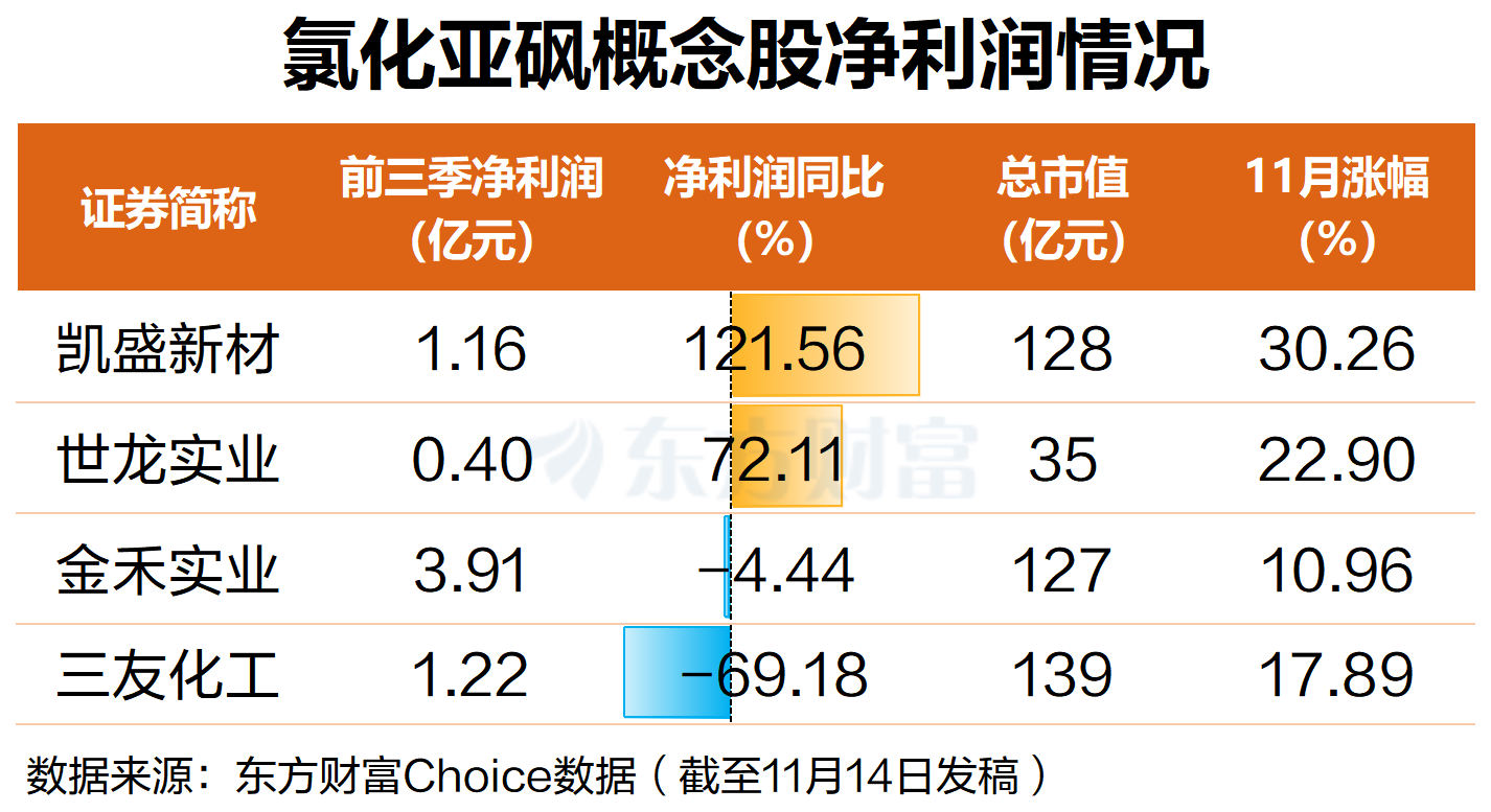 11月14日,A股氯化亚砜概念股早盘集体高开,凯盛新材高开近10%,金禾实业高开近4%,世龙实业高开超5%,三友化工小幅高开。消息方面,氯化亚砜近期价格暴涨。据生意社数据,99%氯化亚砜最新报价1600元/吨,单日涨幅近4%。自10月末至今,约半个月的时间里该品种累计涨幅已超45%,成为市场关注的焦点。