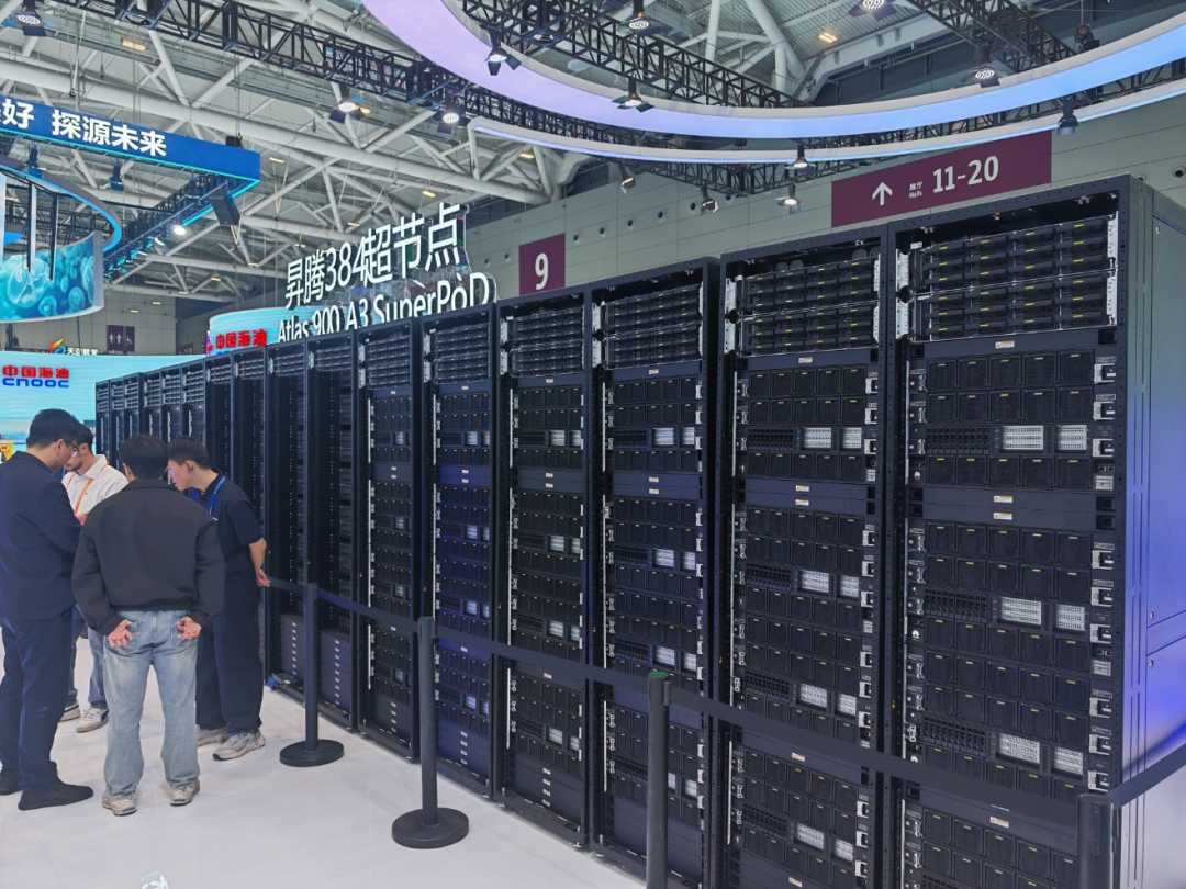 展会现场,光明实验室携手华为、共聚生态等伙伴,共同打造“基于昇腾的国产AI生态主题特展”,完成384超节点“深圳首秀”,充分展示昇腾算力基座“硬实力”。昇腾384超节点图片来源:每经记者孔泽思摄。记者了解到,昇腾384超节点由12个计算柜和4个总线柜构成,整体价值约2亿元。其是由384颗昇腾AI芯片连接在一起组成集群,通过全对等高速互联架构,基于系统工程方法,对计算、内存、通信的极致优化调度,可提供高达300PFLOPs的密集BF16算力,该性能表现接近英伟达GB200 NVL72系统的两倍。