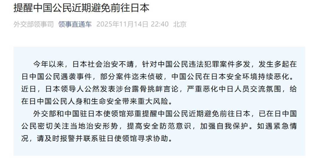 此外,川航、厦航也发布了相关通知,为旅客提供更多选择。今年以来,日本社会治安不靖,针对中国公民违法犯罪案件多发,发生多起在日中国公民遇袭事件,部分案件迄未侦破,中国公民在日本安全环境持续恶化。近日,日本领导人公然发表涉台露骨挑衅言论,严重恶化中日人员交流氛围,给在日中国公民人身和生命安全带来重大风险。