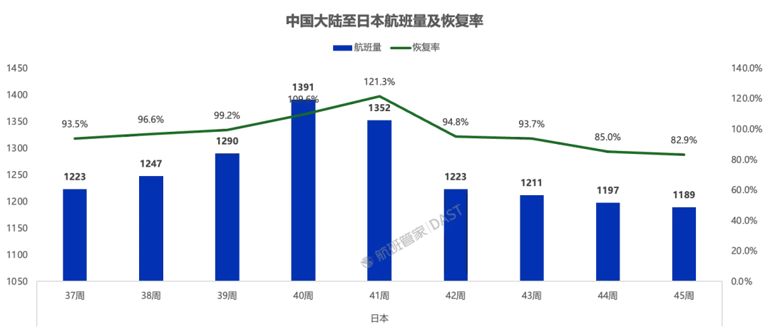 受民航换季及市场因素影响,中国大陆-日本周度航班量已大幅下滑,据航班管家数据,第45周(11.03-11.09)周航班量1189班次,恢复率(较2019年同期)为82.9%,环比第40周下降14.5%。