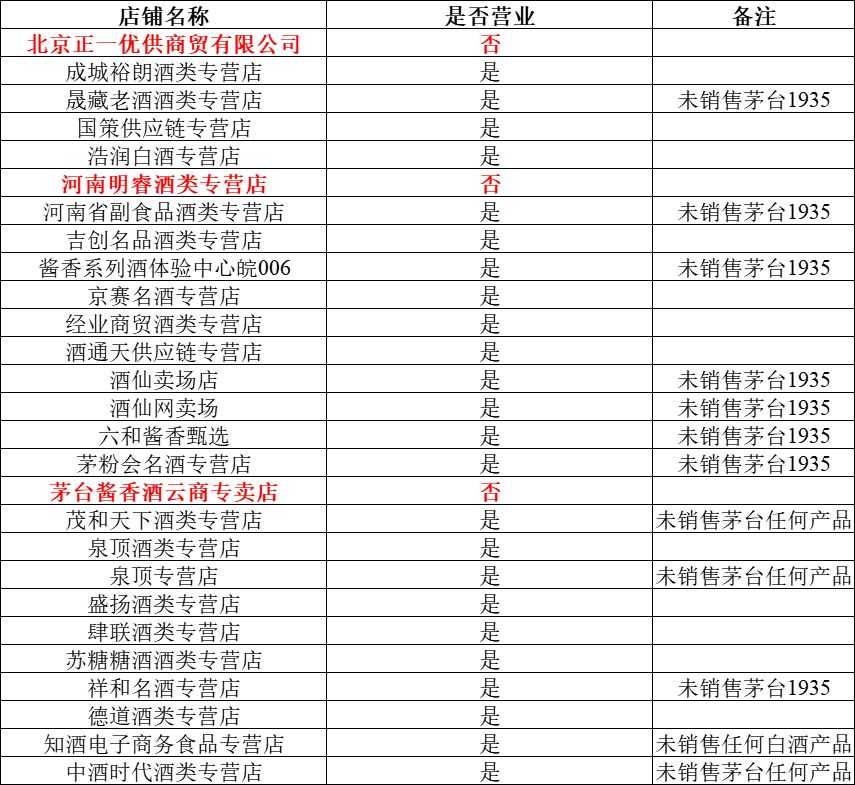 11月15日,有市场消息称,“抖音电商平台关停茅台未授权店铺”。有商家向媒体透露,售卖茅台的店铺都在“等待平台研判”,后续能否销售要等待平台判定店铺是否违规。具体来看,首先是所有带“茅台”的店铺目前都在被平台研判处理,店铺会出现“违规清退”等提示,需等待平台判定结果。其次,售卖1935的商家,马上下架所有1935商品。