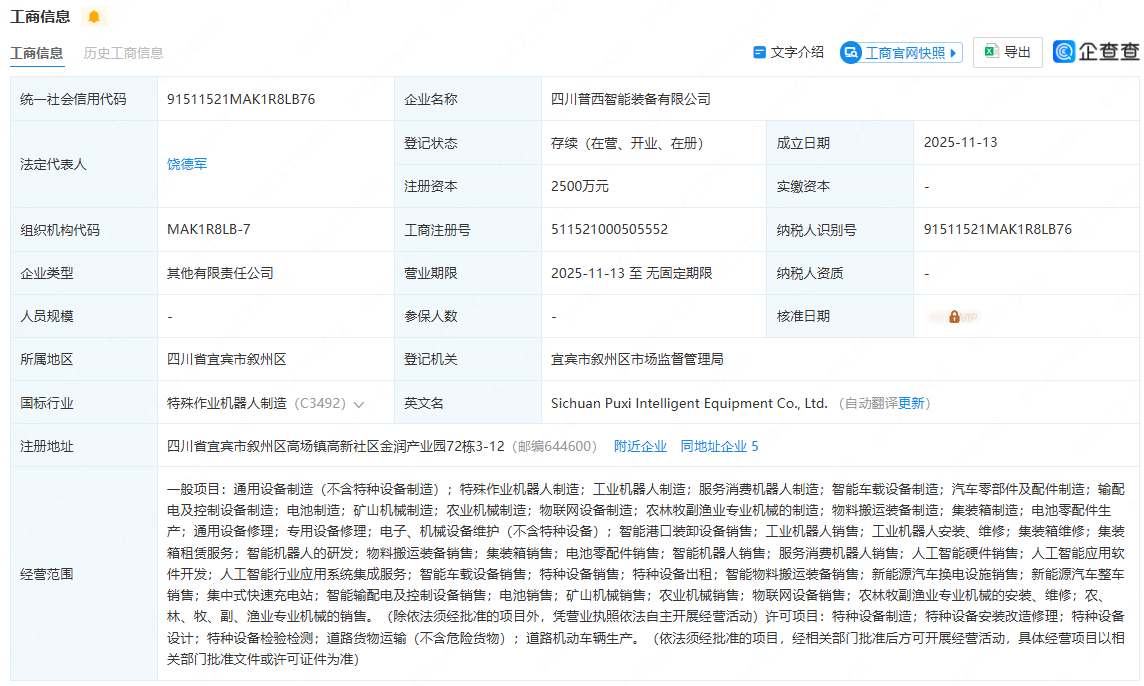 企查查数据显示,四川普西智能装备有限公司成立,注册资本2500万元,经营范围含智能机器人研发销售、人工智能应用开发等。公司由五粮液集团全资子公司等共同持股,为智能装备领域注入新活力。