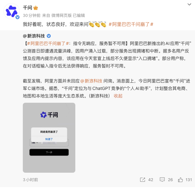 11月17日,阿里巴巴新推出的AI应用“千问”公测首日即遭遇流量洪峰,部分服务出现拥堵和中断,“阿里巴巴千问崩了”话题冲上微博热搜,阿里千问回应状态良好。