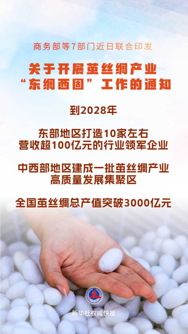 商务部等7部门联合印发关于开展茧丝绸产业“东绸西固”工作的通知,要求统筹资源推进现代产业体系建设,到2028年东部打造领军企业与知名品牌,中西部建成集聚区,突破关键技术,全国总产值突破3000亿元。
