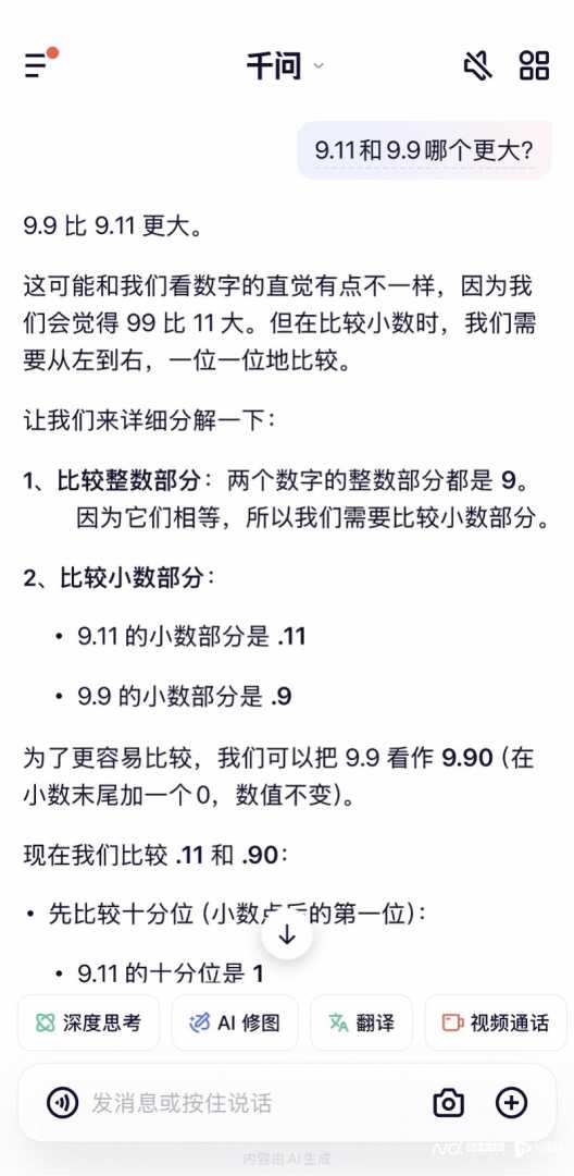 比如,请千问APP帮忙把公司楼下打印店老板的猫P到埃及神庙去,顺便把它身上的衣服也换掉,换一身铠甲,让它看起来庄重、威严。千问生成的猫确实看起来肌肉含量高了很多。拿早期大模型频繁翻车的小学数学题“9.9和9.11谁大”问千问APP,它也不带一点犹豫地给你回应9.9大,当然还附上了推理过程,很详细。