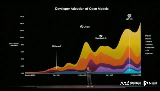 不过,在海内外的B端和开发者层面,阿里Qwen系列模型已经是耳熟能详的存在。亚马逊用Qwen来训练操作自己的人形机器人;苹果科学家在Qwen新模型发布第一时间,提供IOS体系的适配,认为千问3与苹果机器学习框架MLX是最佳搭档;英伟达开源的多个模型,基座都来自于Qwen。此外,英伟达CEO黄仁勋屡次点赞阿里千问Qwen,近期在2025年GTC华盛顿大会上,黄仁勋认为开源模型对AI技术及应用的发展作出重大贡献,公开表示阿里千问Qwen已占据开源模型的大部分市场份额,其领先优势还在持续扩大中。