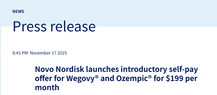 诺和诺德在新闻稿中解释道,“这些优惠是继最近与美国政府达成协议之后推出的,该协议旨在扩大肥胖症和其他慢性疾病(如糖尿病)患者获得药物的途径,同时在2026年降低直接面向患者的自费渠道的价格——而今天,诺和诺德提前数月将这些价格带给了消费者。”
